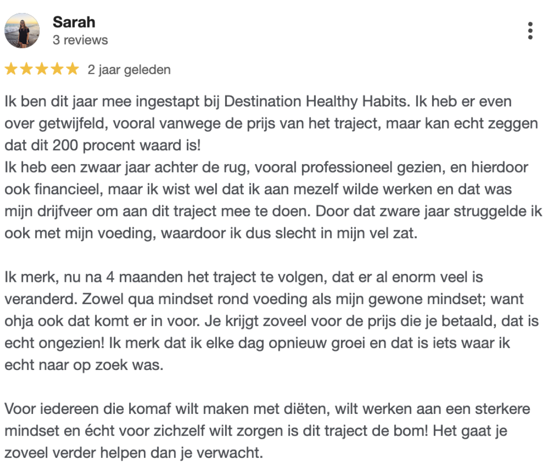 Ben je het beu om constant bezig te zijn met afvallen? Heb je al veel geprobeerd maar kan je niets volhouden? In deze masterclass krijg je mijn unieke healthy habits framework bomvol inzichten. Na deze online masterclass weet jij wat je moet doen om op lange termijn jouw gezond gewicht te bereiken. Opgelet: je krijgt geen quick fixes