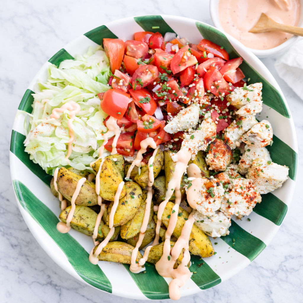 ResetEen bowl met airfryer krieltjes en kruidige kipblokjes, gecombineerd met ijsbergsla, kerstomaten en ui. Afgewerkt met een drizzle srirachamayonaise. Snelle en easy dinner receptje!