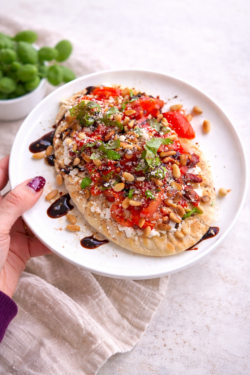ResetCottage cheese vormt de basis van deze flatbread, afgewerkt met tomaatjes, zongedroogde tomaten, basilicum en Parmezaanse kaas. De balsamicocrème geeft de flatbread een heerlijke zoetzure toets! 🤩
