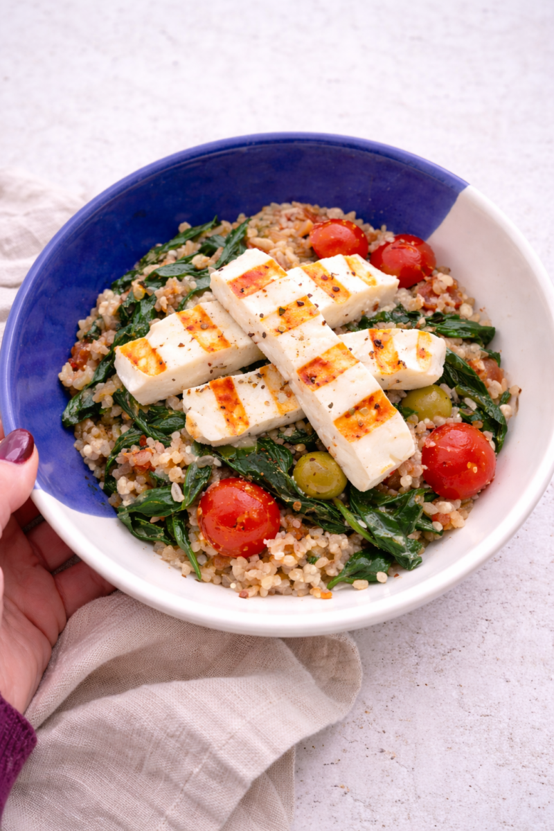 Een warme, hartige haverpan met spinazie, tomaatjes, olijven en gegrilde halloumi. Zo mega smaakvol!! 😇