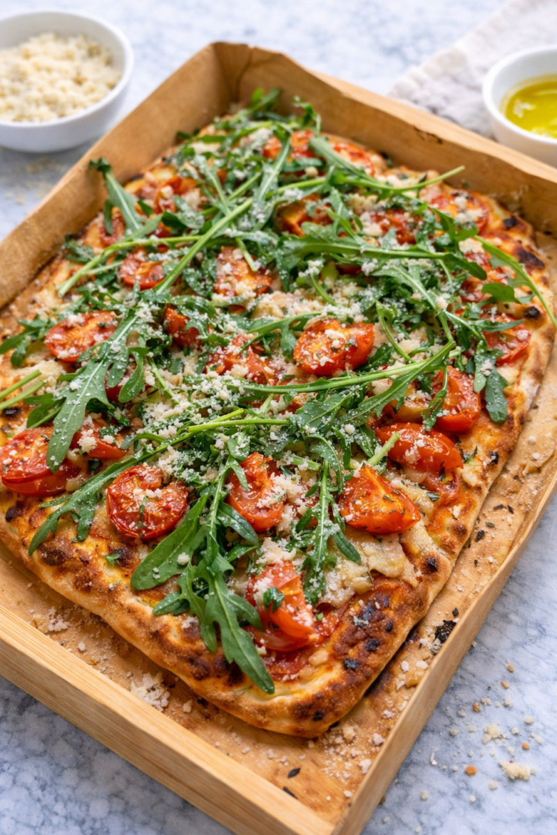 ResetEen krokante pinsa met een frisse topping van kerstomaten en rucola. Simpel, snel en altijd een succes als lichte lunch of snelle avondmaaltijd!